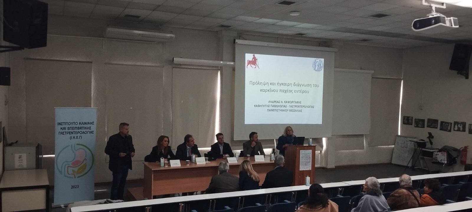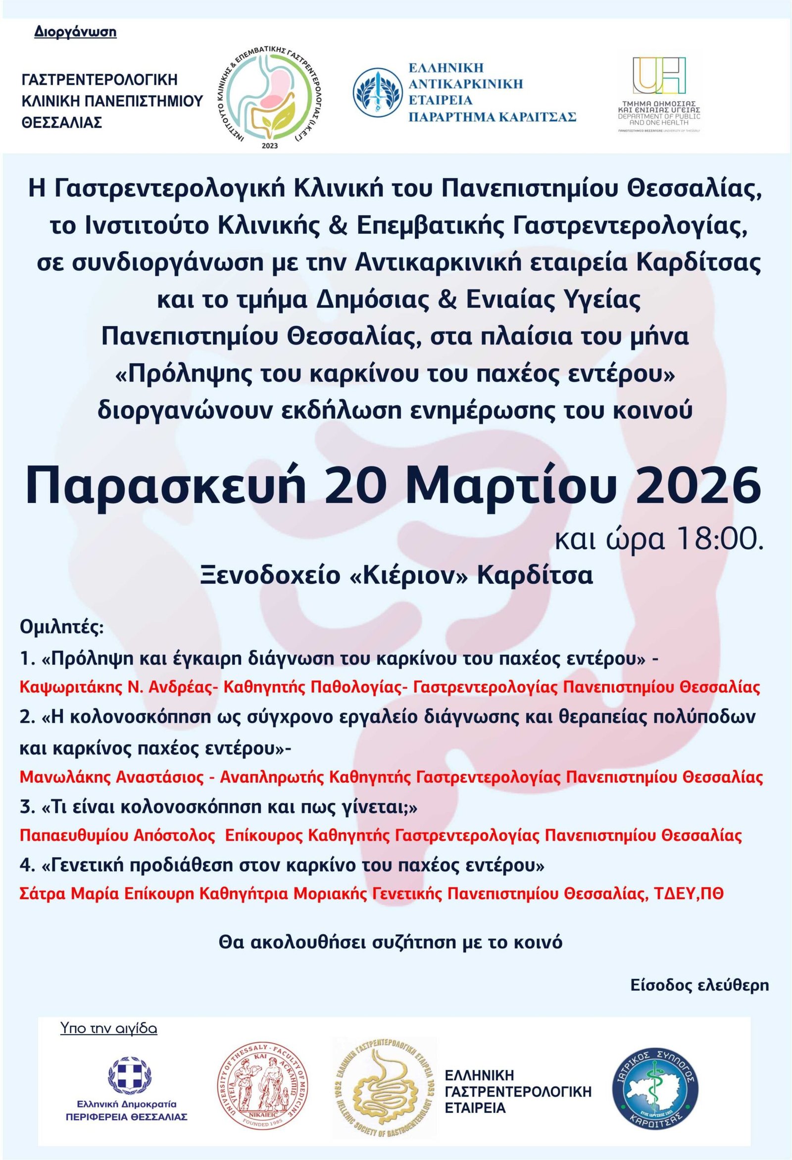 Η Γαστρεντερολογική Κλινική του Πανεπιστημίου Θεσσαλίας και το Ινστιτούτο Κλινικής και Επεμβατικής Γαστρεντερολογίας, στα πλαίσια του μήνα πρόληψης του καρκίνου του παχέος εντέρου, διοργάνωσαν με επιτυχία εκδηλώσεις ενημέρωσης του κοινού, στην Καρδίτσα και στην Λάρισα 20 και 21 Μαρτίου 2026, αντίστοιχα.